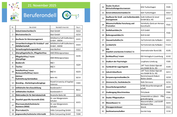 Am 21. November 2025 fand erneut das Berufe-Rondell an unserer Schule statt. Wir hatten die großartige Unterstützung von 35 Betrieben, Universitäten und berufsbildenden Schulen, die insgesamt 41 verschiedene Berufsbilder vorstellten. Von „Angewandter Informatik“ bis „Zimmerer/ Zimmerin“ war ein großes, buntes Angebot wählbar. Herzlichen Dank an alle, ihr Wissen an unsere Schülerschaft weitergegeben und den Weg zur beruflichen Orientierung mit neuem Input gefüllt haben.