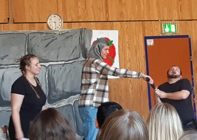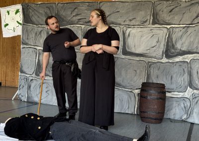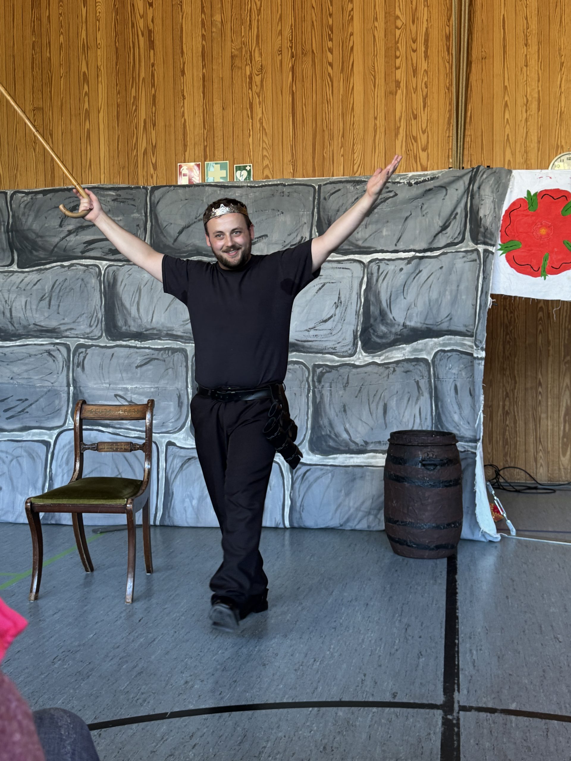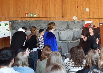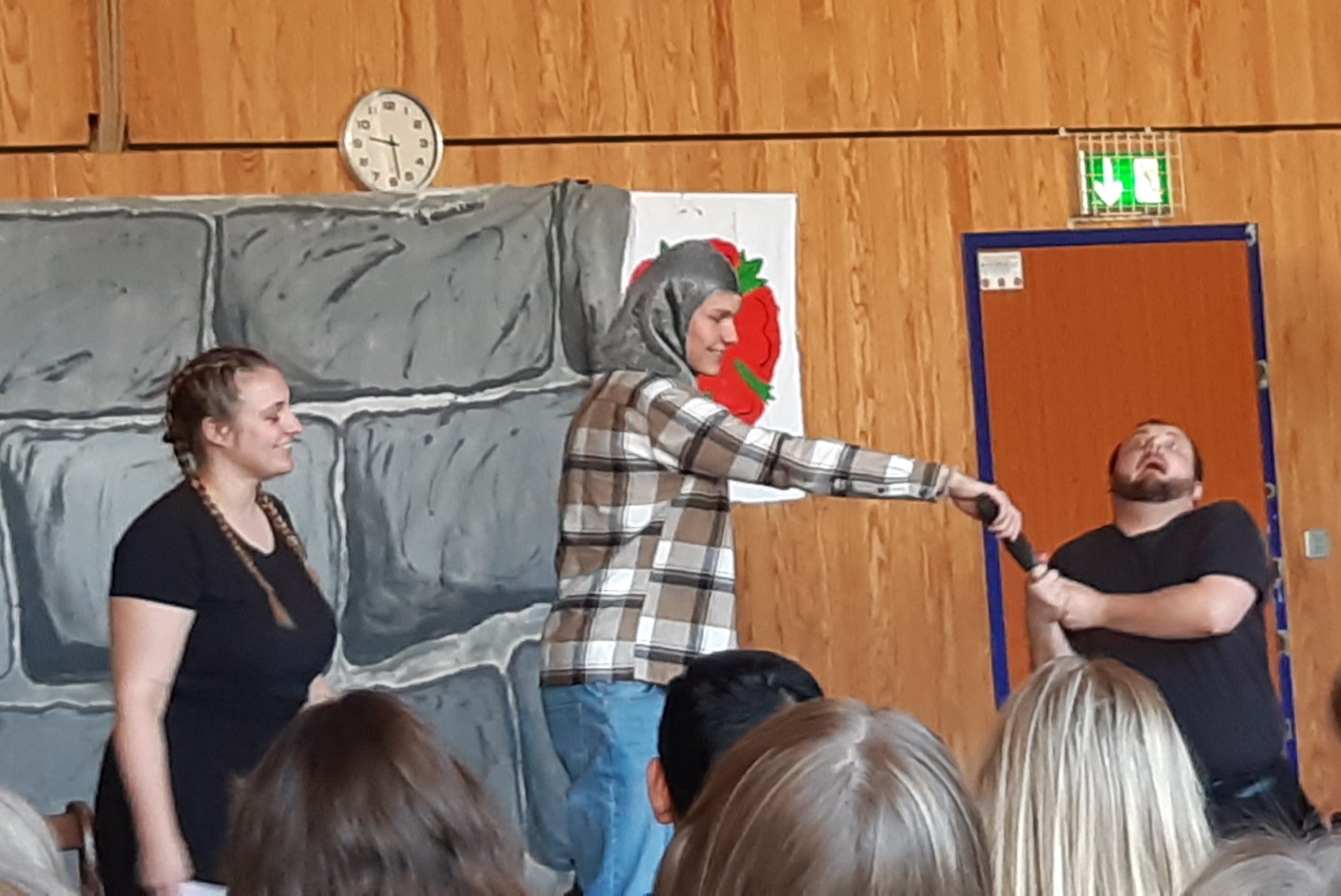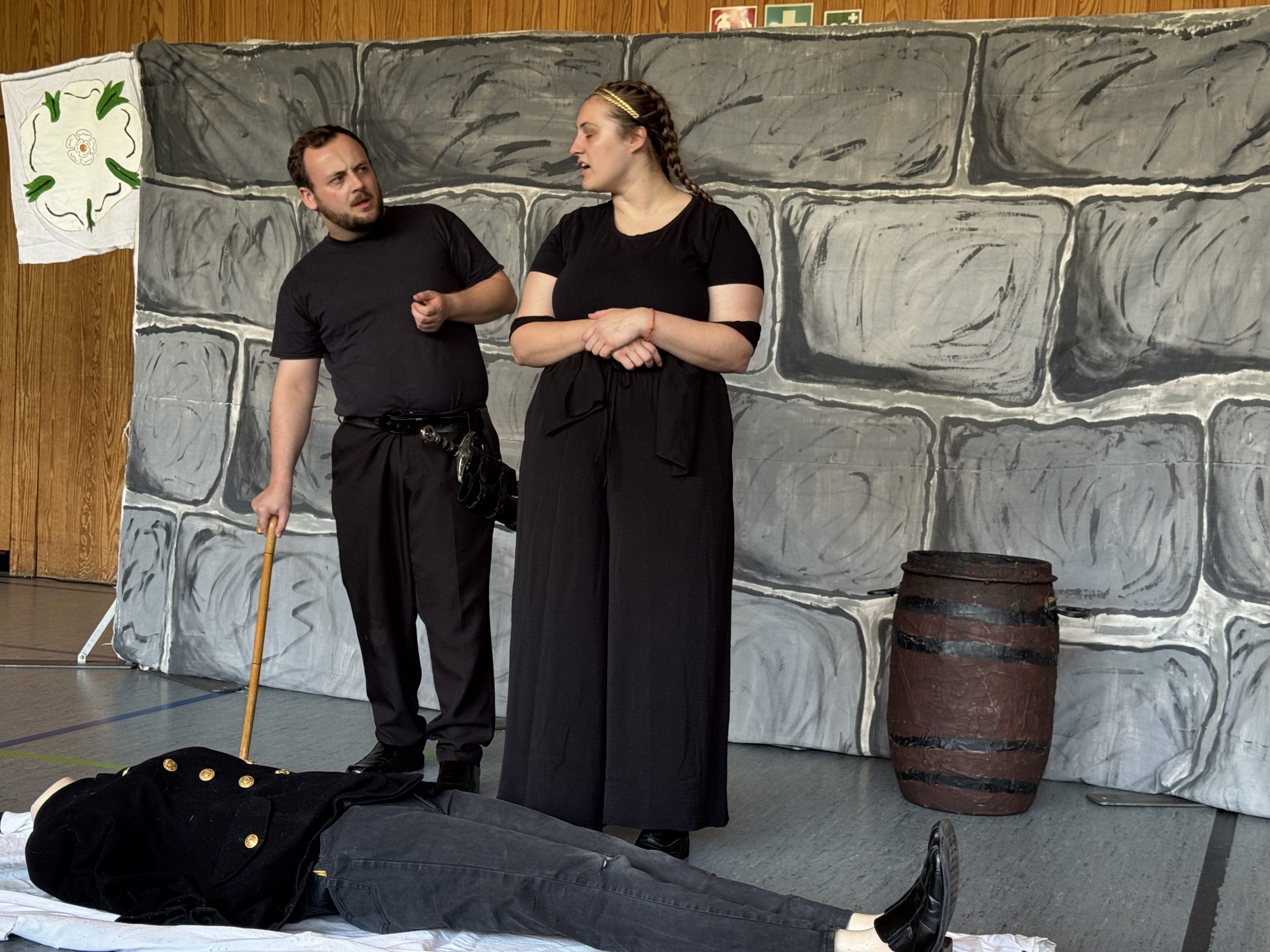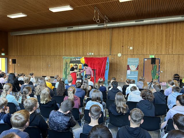 Matt und Mia, die beiden jungen Schauspieler aus Großbritannien, überzeugten in ihren unterschiedlichen Rollen im Wild-West-Setting von „Saddle Up“ und schafften es gleichzeitig, den Schülerinnen und Schülern der Oberstufe Shakespeares „Richard III“ verständlich und humorvoll näher zu bringen.