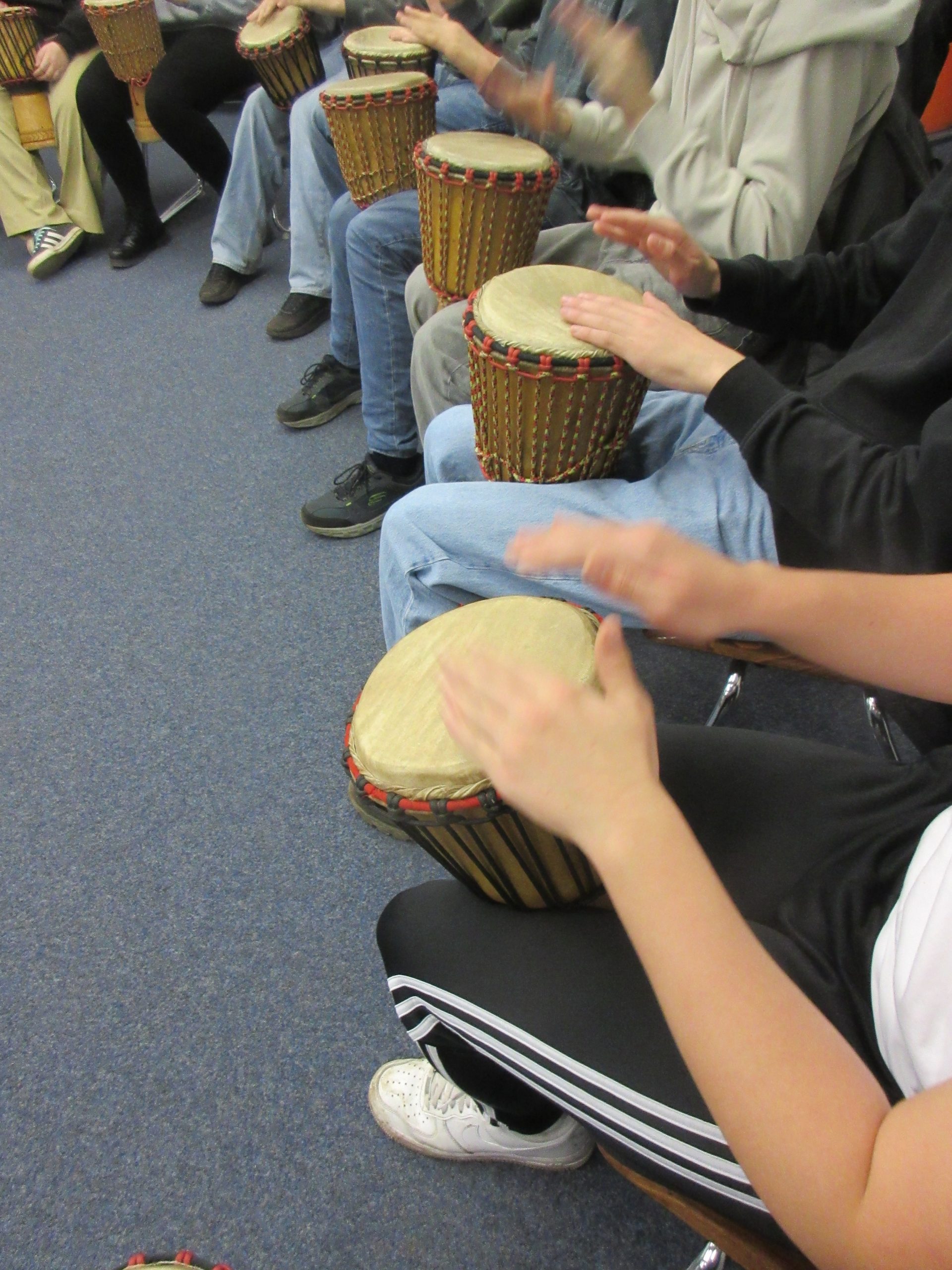 Besonders rhythmisch ging es im 8. Jahrgang zu. Dort studierten die Schülerinnen und Schüler Melodien und Rhythmen auf Dschemben ein, die von den Workshopleitern „Trommelkunst“ zunächst vorgespielt wurden. Die Schülerinnen und Schüler, aufgeteilt auf drei Gruppen, spielten die Rhythmen nach, um sich am Ende des Workshops zu einem großen Trommelensemble zusammen zu finden. Im Abschlusskonzert wurde eindrucksvoll deutlich, wie auch mehr als 100 Teenager gemeinsam einen Rhythmus spielen und halten können.